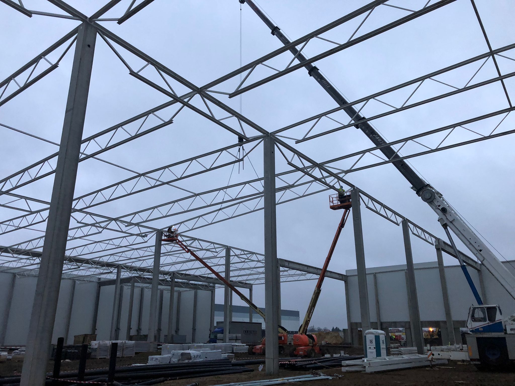 Konstrukcję dachu stanowią 12,0m i 24,0m płatwie kratownicowe stalowe, oparte na podciągach stalowych 12m oraz słupach żelbetowych za pośrednictwem krótkich stalowych słupów (adapterów) utwierdzonych w podstawie oraz na 24m dźwigarach sprężanych. Szerokość osiowa hali jest zmienna i wynosi: 144,0m – 84,0m, a długość całkowita hali 336,0m.